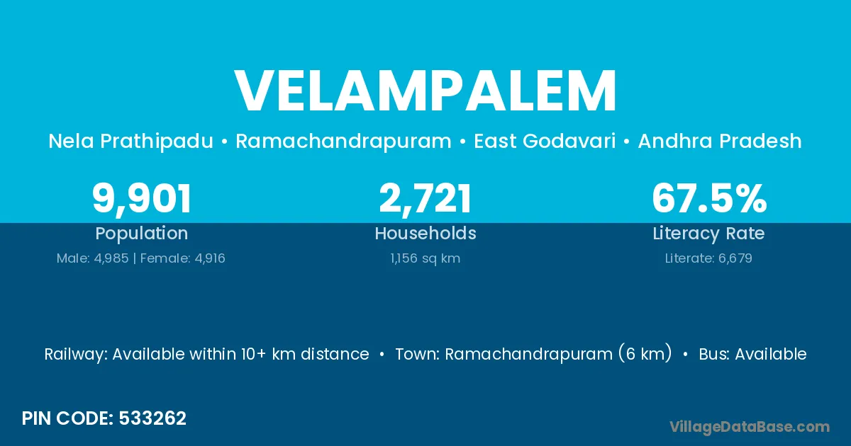 Ramachandrapuram (6 km) is the nearest town to Velampalem village for major economic activities and is located approximately 6 km away.