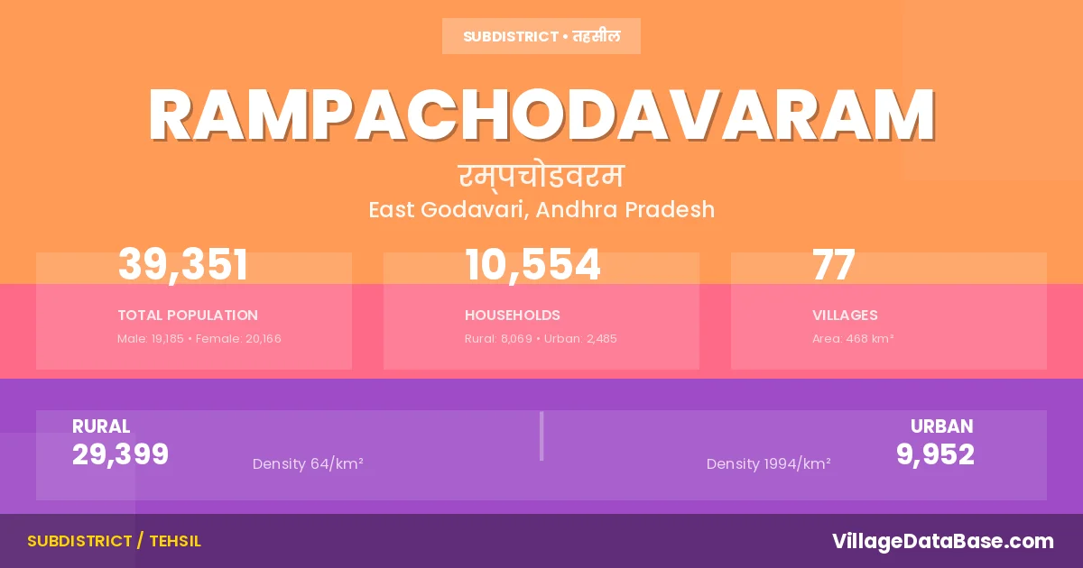 According to the 2011 census The total area of Rampachodavaram Mandal is 468 km², with a population of 39351 people. The population density is 84 inhabitants per square kilometre, and there are approximately 10554 houses in the sub district.