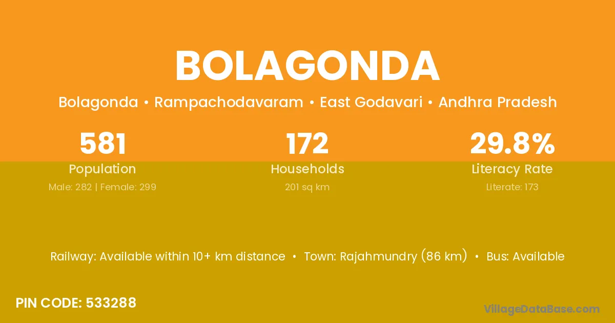 Rajahmundry (86 km) is the nearest town to Bolagonda village for major economic activities and is located approximately 86 km away.
