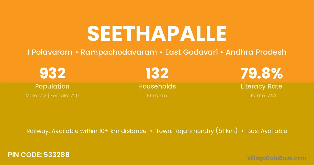 Seethapalle village has a total population of 932 people, of which 212 are males and 720 are females.