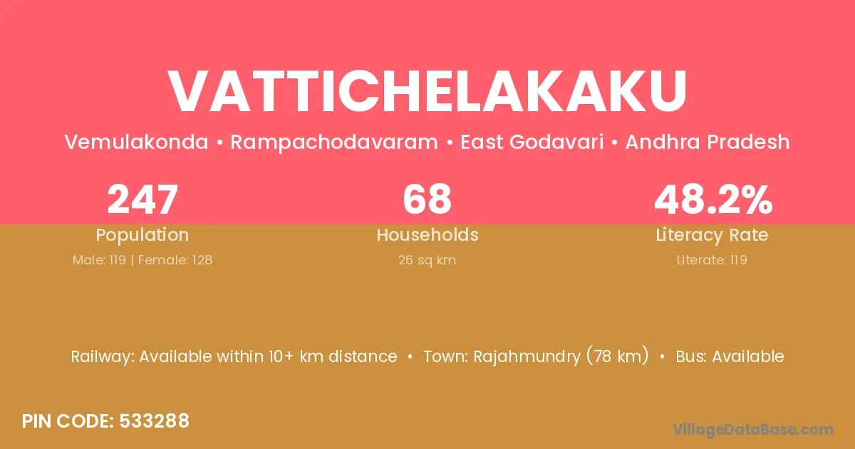 Rajahmundry (78 km) is the nearest town to Vattichelakaku village for major economic activities and is located approximately 78 km away.