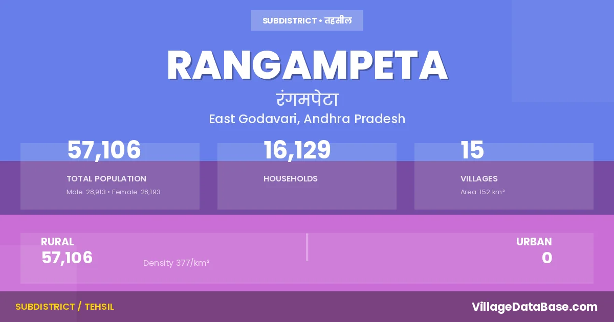 According to the 2011 census The total area of Rangampeta Mandal is 152 km², with a population of 57106 people. The population density is 377 inhabitants per square kilometre, and there are approximately 16129 houses in the sub district.