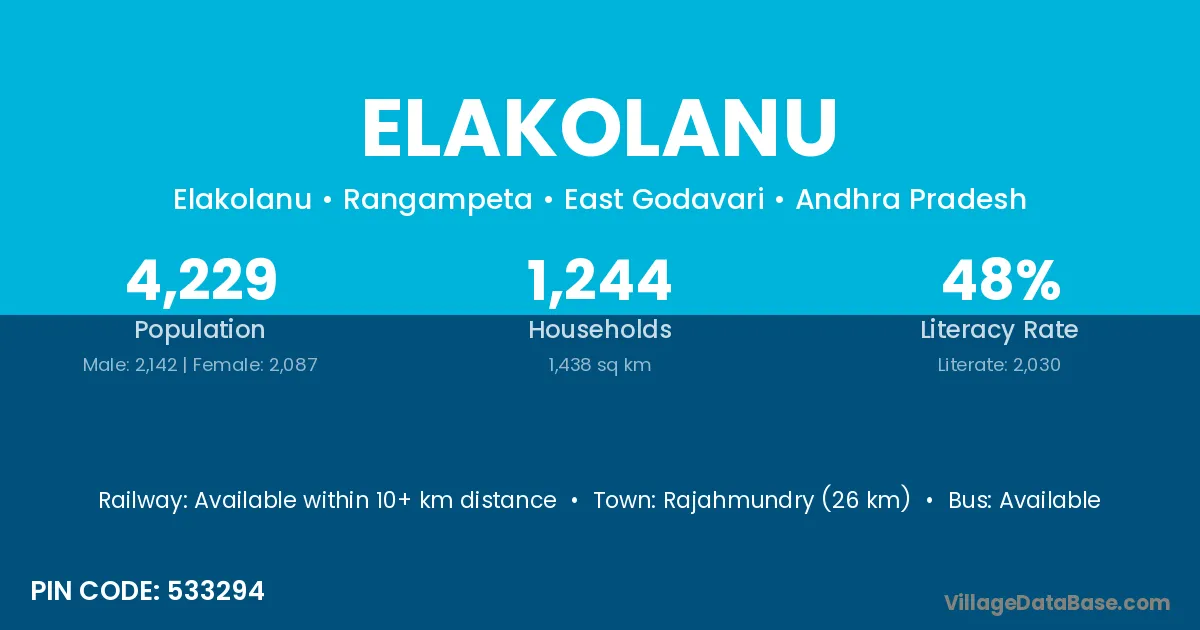Rajahmundry (26 km) is the nearest town to Elakolanu village for major economic activities and is located approximately 26 km away.