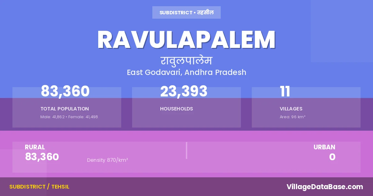 According to the 2011 census The total area of Ravulapalem Mandal is 96 km², with a population of 83360 people. The population density is 870 inhabitants per square kilometre, and there are approximately 23393 houses in the sub district.
