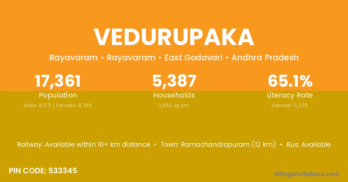 Ramachandrapuram (12 km) is the nearest town to Vedurupaka village for major economic activities and is located approximately 12 km away.