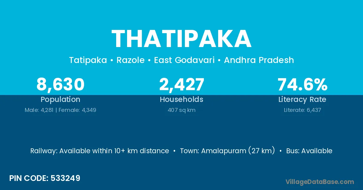 Amalapuram (27 km) is the nearest town to Thatipaka village for major economic activities and is located approximately 27 km away.