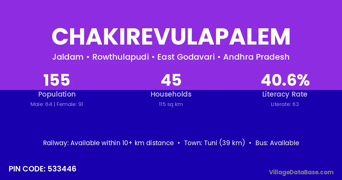 Tuni (39 km) is the nearest town to Chakirevulapalem village for major economic activities and is located approximately 39 km away.