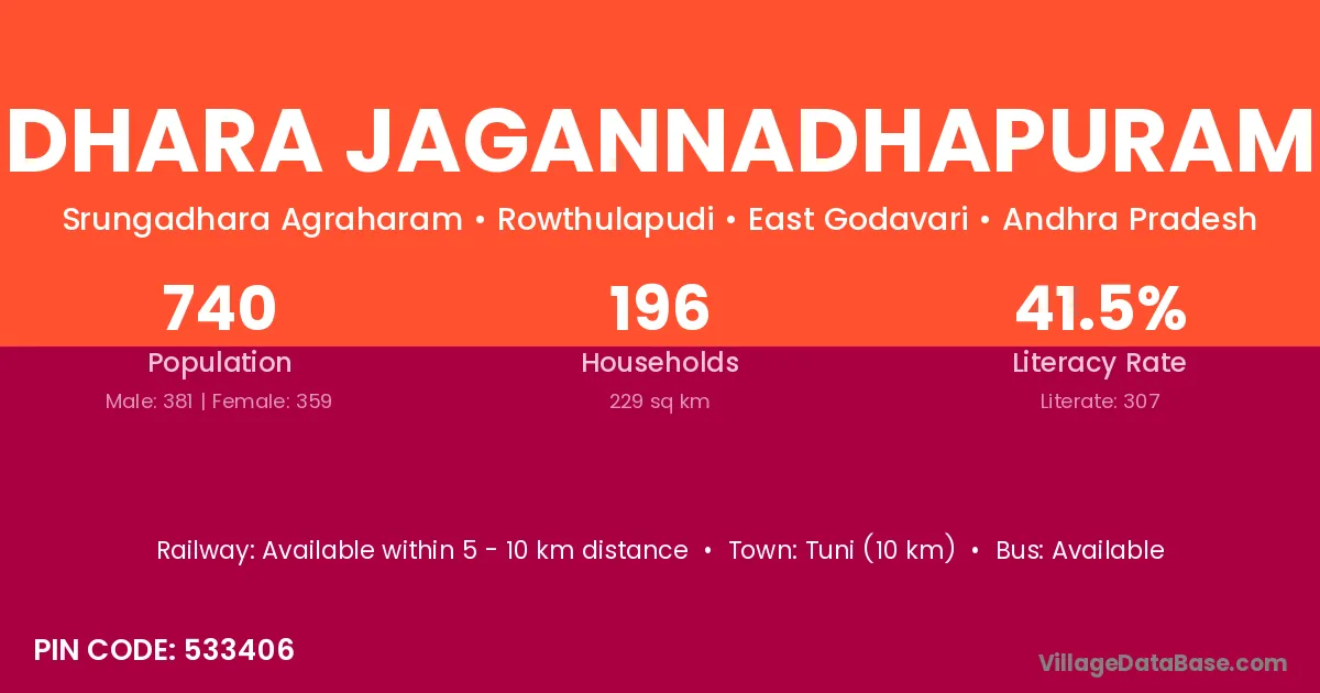 Dhara Jagannadhapuram village has a total population of 740 people, of which 381 are males and 359 are females.