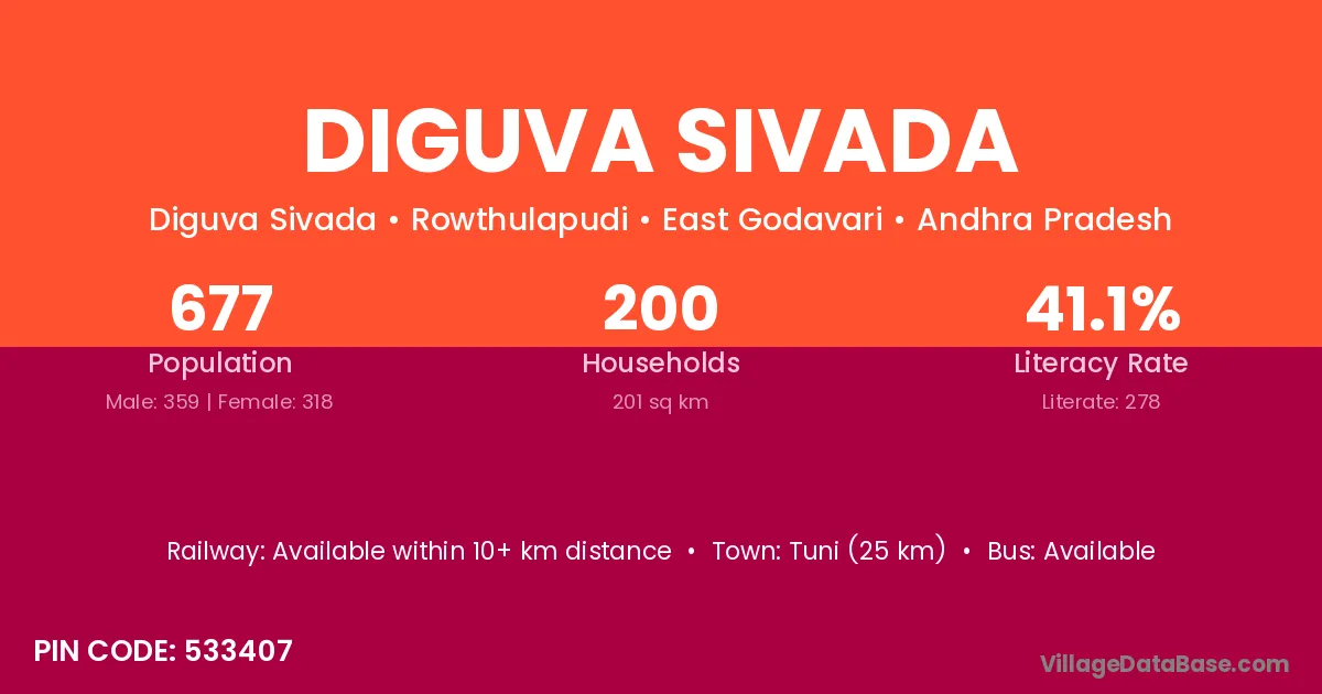 Tuni (25 km) is the nearest town to Diguva Sivada village for major economic activities and is located approximately 25 km away.
