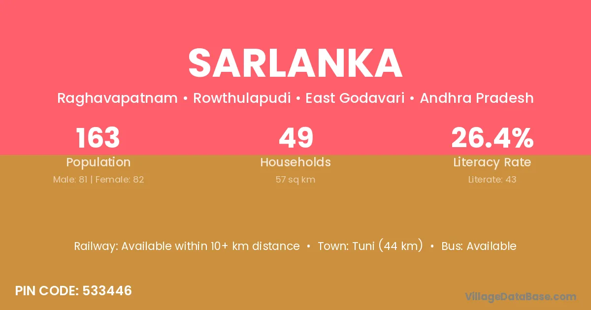 Tuni (44 km) is the nearest town to Sarlanka village for major economic activities and is located approximately 44 km away.