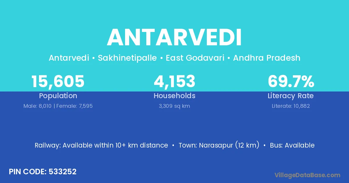 Narasapur (12 km) is the nearest town to Antarvedi village for major economic activities and is located approximately 12 km away.