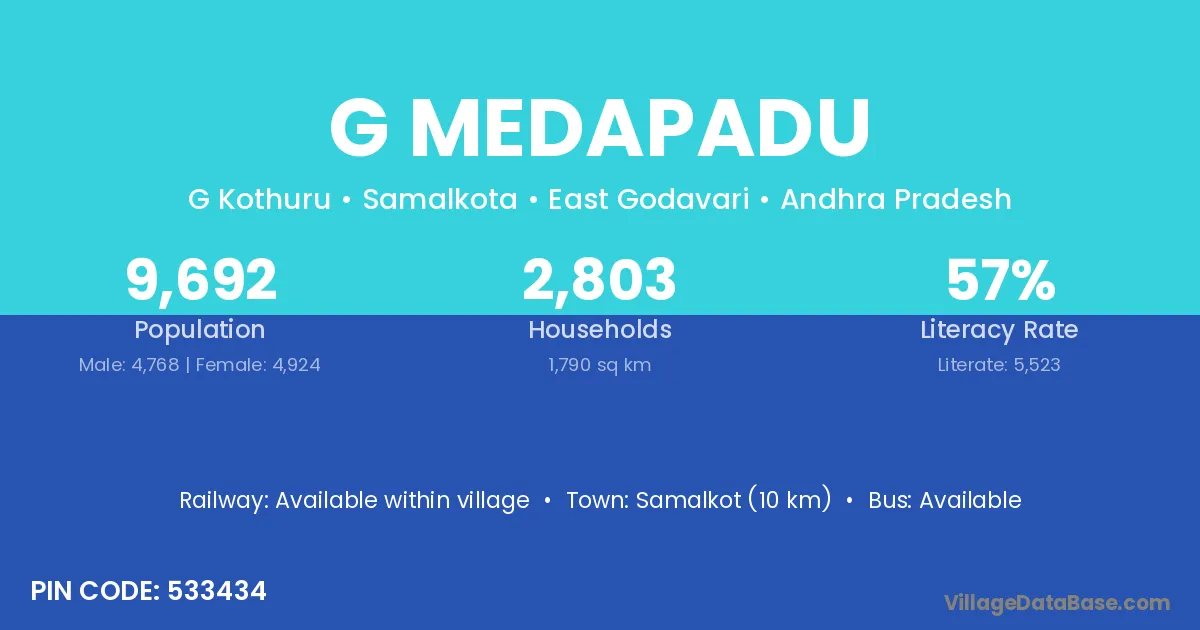 Samalkot (10 km) is the nearest town to G Medapadu village for major economic activities and is located approximately 10 km away.