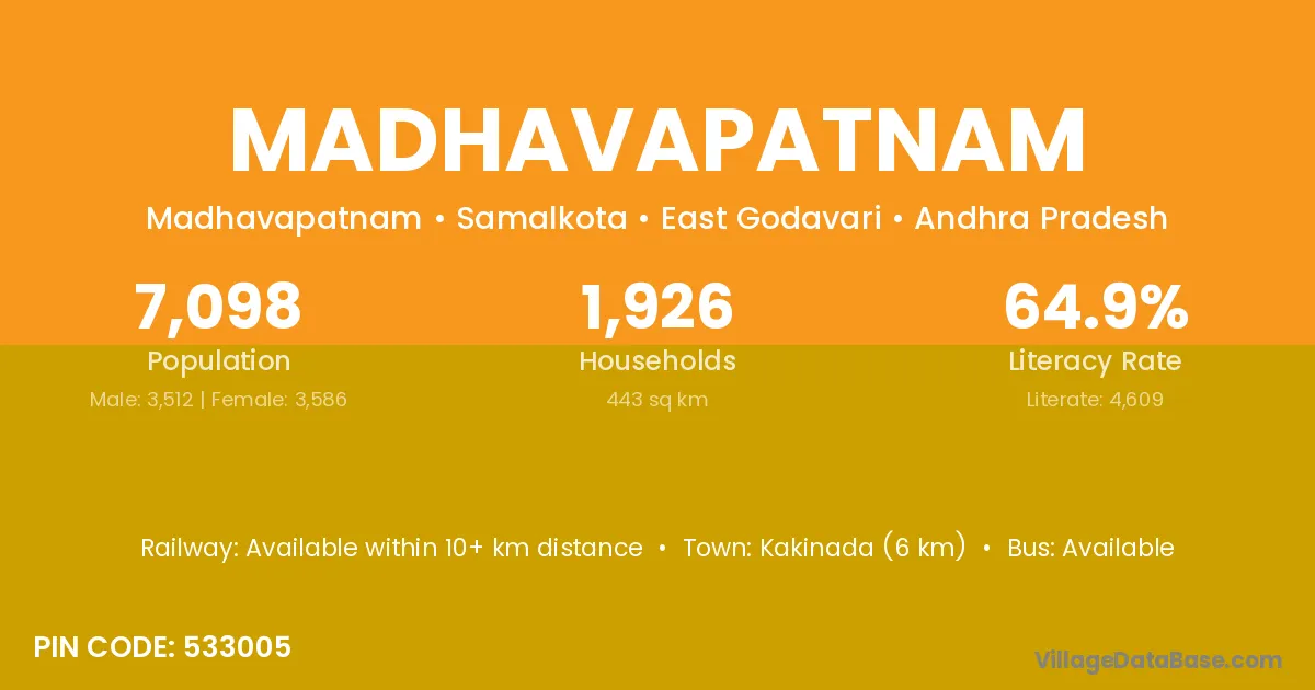 Kakinada (6 km) is the nearest town to Madhavapatnam village for major economic activities and is located approximately 6 km away.