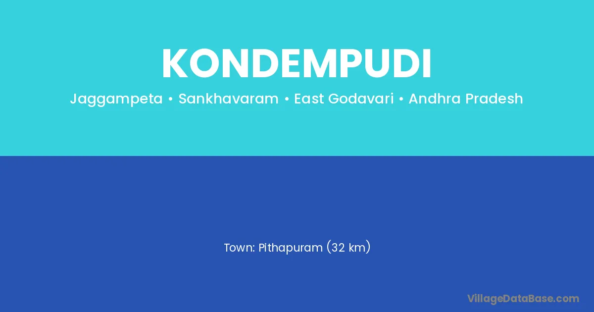 Pithapuram (32 km) is the nearest town to Kondempudi village for major economic activities and is located approximately 32 km away.