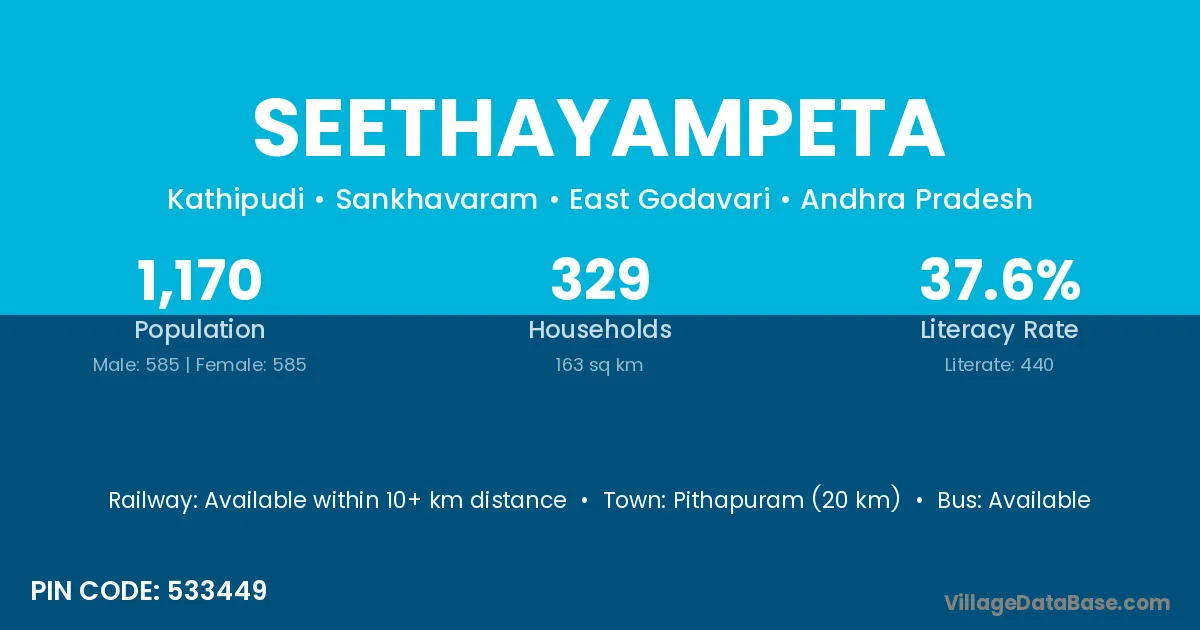 Seethayampeta village has a total population of 1,170 people, of which 585 are males and 585 are females.