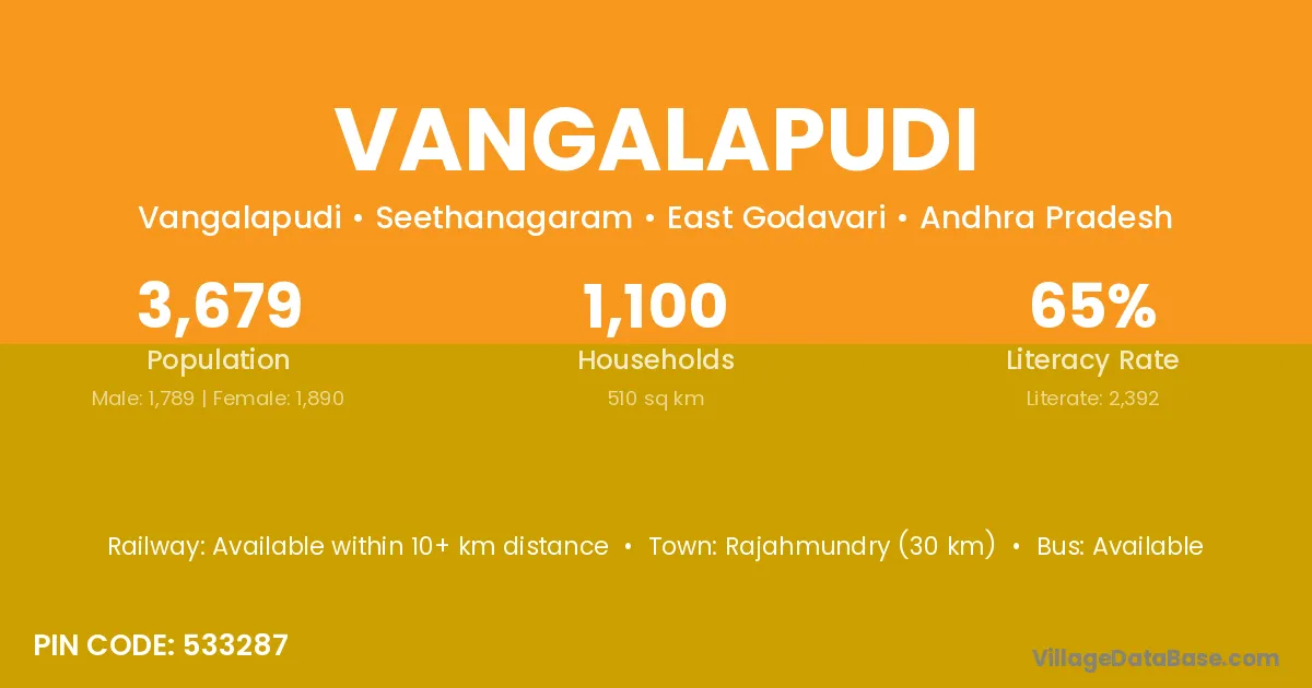 Vangalapudi village has a total population of 3,679 people, of which 1,789 are males and 1,890 are females.
