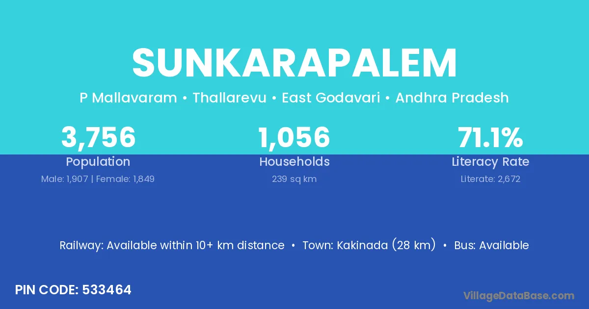 Sunkarapalem village has a total population of 3,756 people, of which 1,907 are males and 1,849 are females.