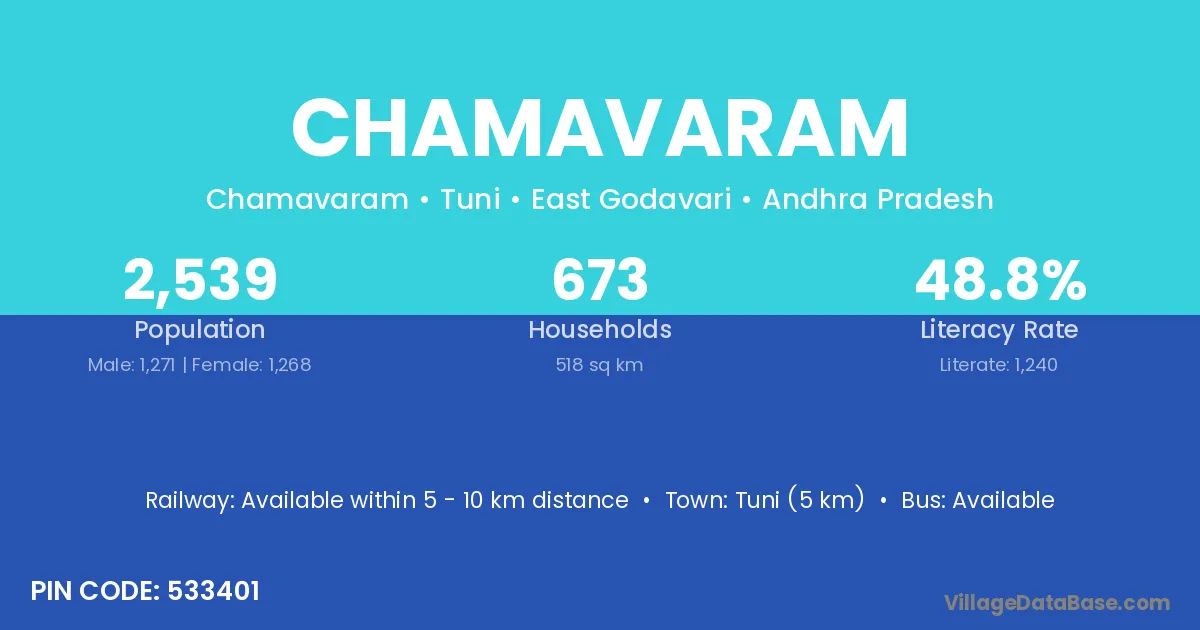 Tuni (5 km) is the nearest town to Chamavaram village for major economic activities and is located approximately 5 km away.