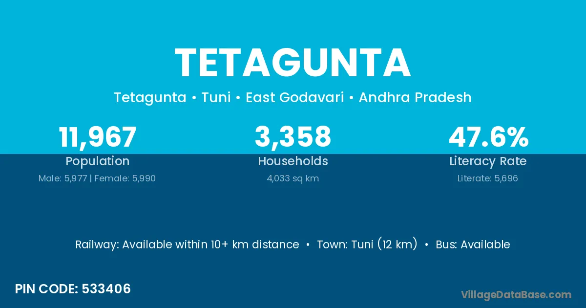 Tuni (12 km) is the nearest town to Tetagunta village for major economic activities and is located approximately 12 km away.