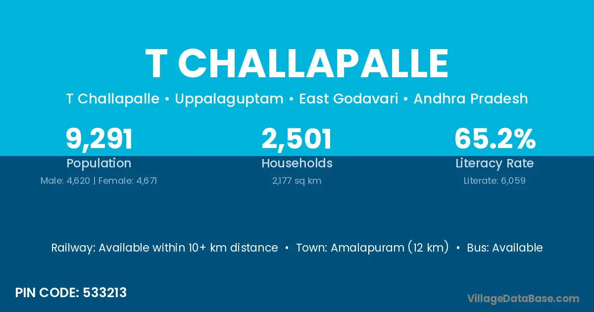 Amalapuram (12 km) is the nearest town to T Challapalle village for major economic activities and is located approximately 12 km away.