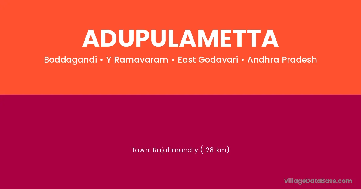 Rajahmundry (128 km) is the nearest town to Adupulametta village for major economic activities and is located approximately 128 km away.