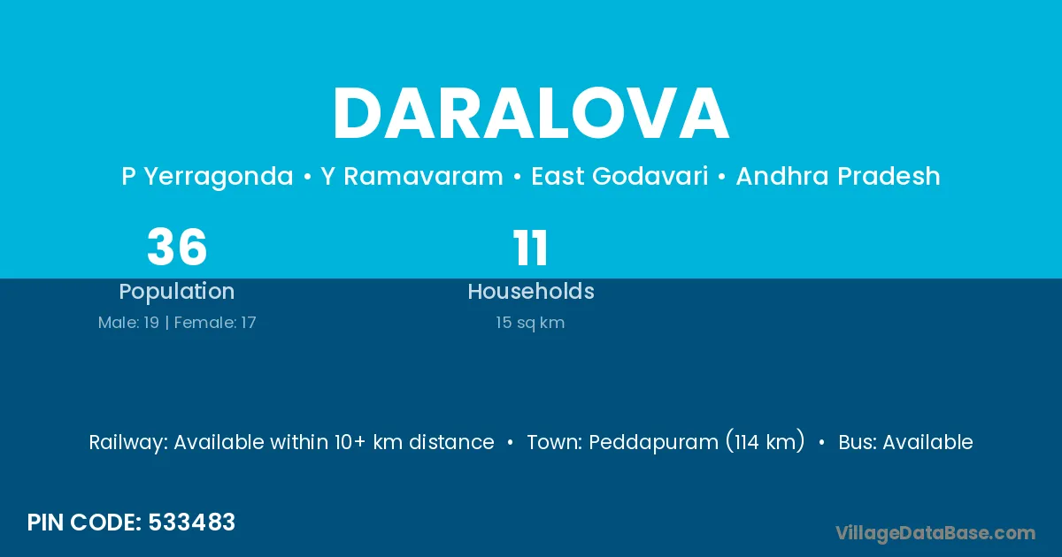 Peddapuram (114 km) is the nearest town to Daralova village for major economic activities and is located approximately 114 km away.