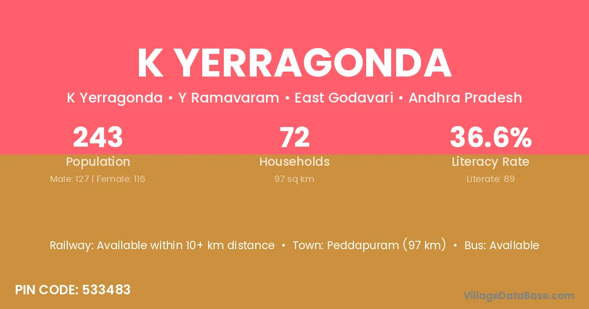 Peddapuram (97 km) is the nearest town to K Yerragonda village for major economic activities and is located approximately 97 km away.