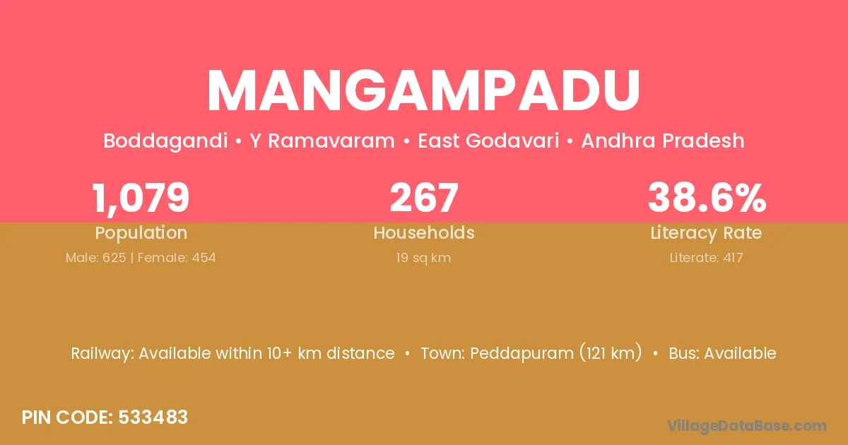 Mangampadu village has a total population of 1,079 people, of which 625 are males and 454 are females.