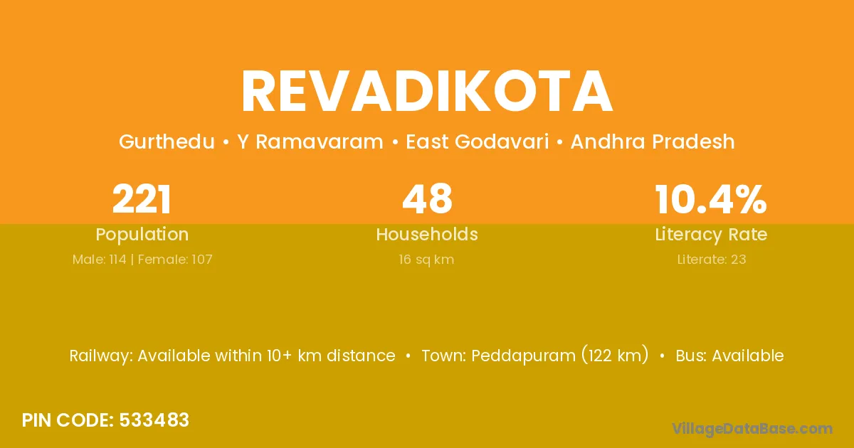 Revadikota village has a total population of 221 people, of which 114 are males and 107 are females.