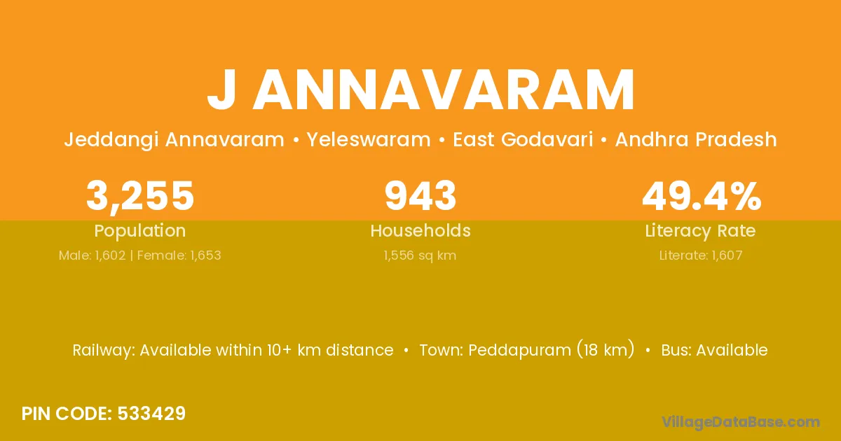 J Annavaram village has a total population of 3,255 people, of which 1,602 are males and 1,653 are females.