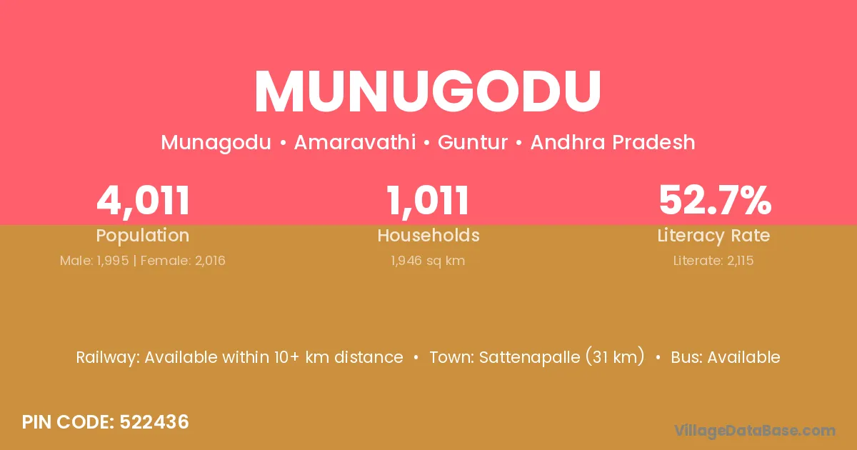 Sattenapalle (31 km) is the nearest town to Munugodu village for major economic activities and is located approximately 31 km away.
