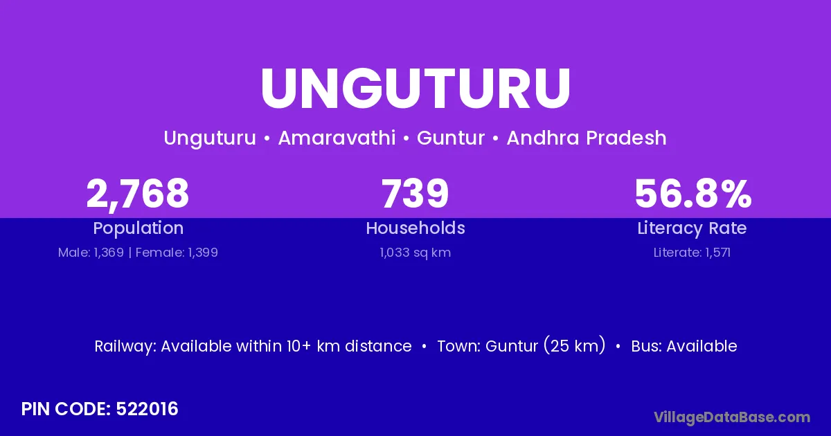 Guntur (25 km) is the nearest town to Unguturu village for major economic activities and is located approximately 25 km away.