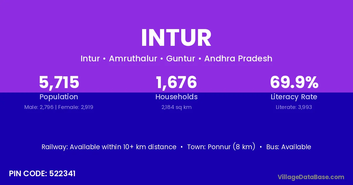 Ponnur (8 km) is the nearest town to Intur village for major economic activities and is located approximately 8 km away.