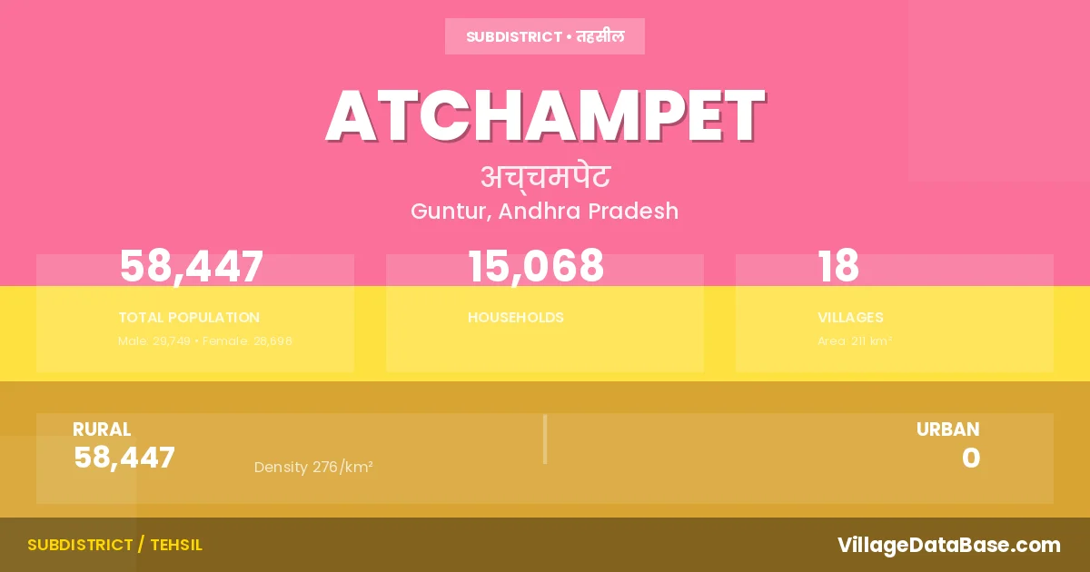 According to the 2011 census The total area of Atchampet Mandal is 211 km², with a population of 58447 people. The population density is 276 inhabitants per square kilometre, and there are approximately 15068 houses in the sub district.