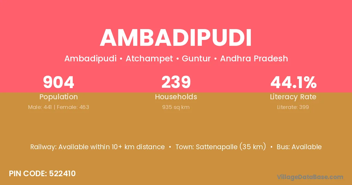 Ambadipudi village has a total population of 904 people, of which 441 are males and 463 are females.