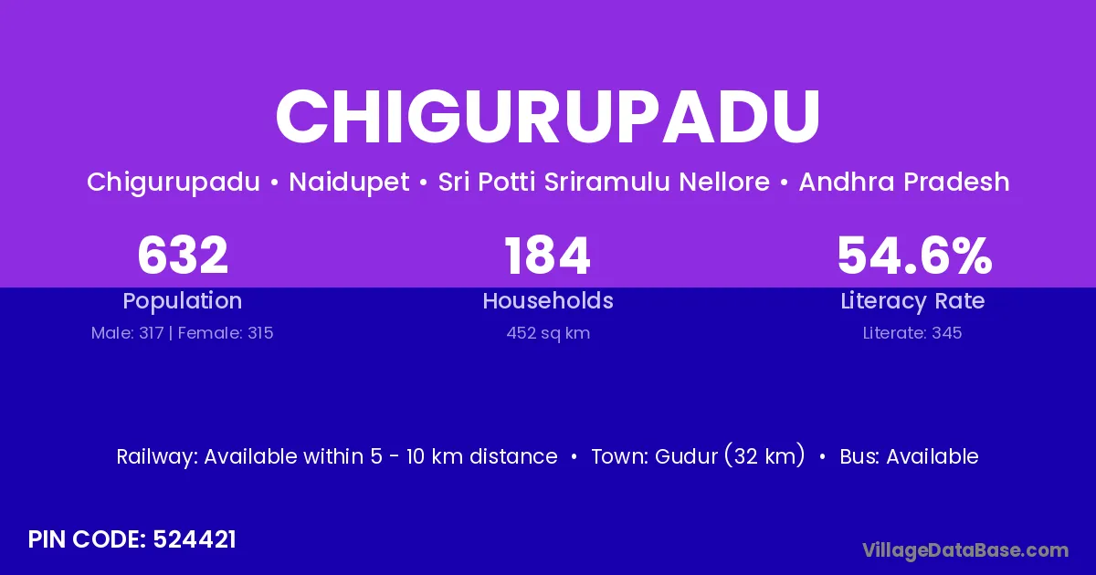 The literacy rate of Chigurupadu village is 42.87%. Male literacy stands at 52.94% and female literacy at 32.92%.