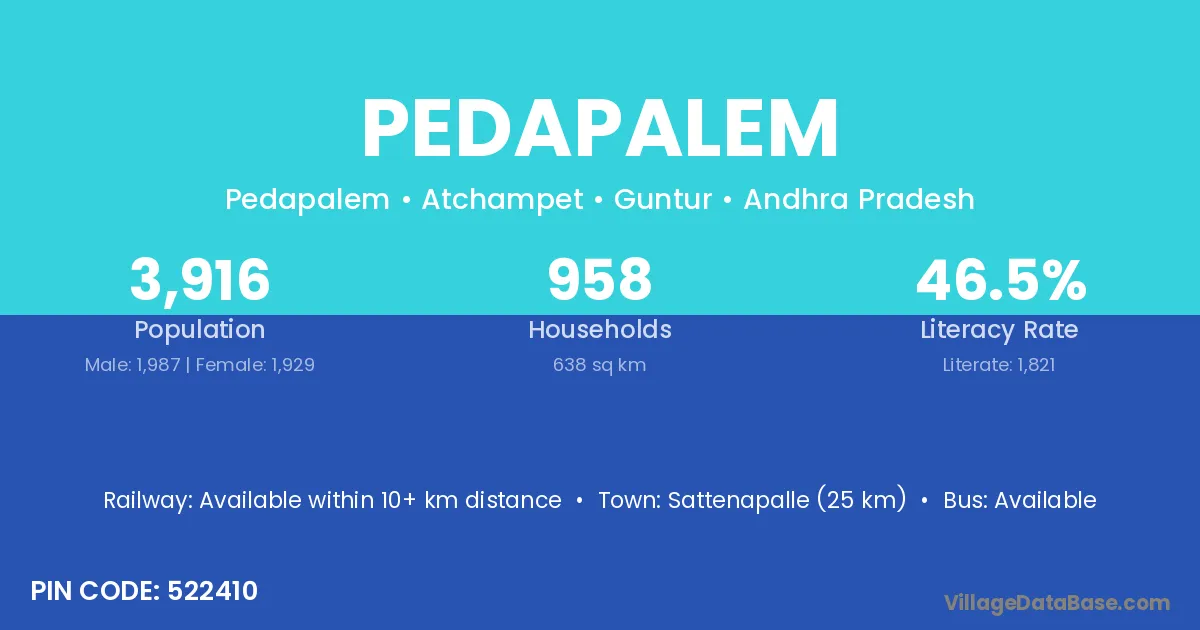 Pedapalem village has a total population of 3,916 people, of which 1,987 are males and 1,929 are females.