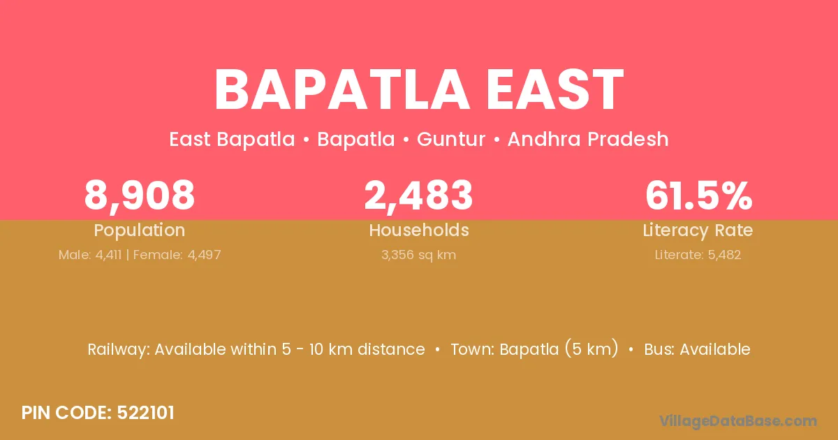 Bapatla (5 km) is the nearest town to Bapatla East village for major economic activities and is located approximately 5 km away.