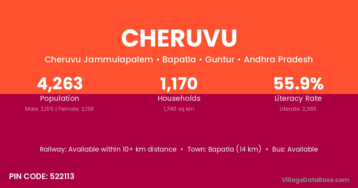 According to Census 2011 information, the village code of Cheruvu village is 522113.