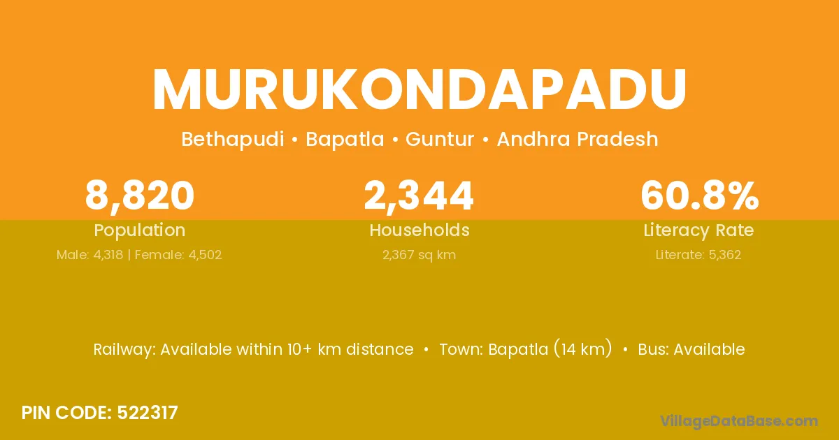 Murukondapadu village has a total population of 8,820 people, of which 4,318 are males and 4,502 are females.
