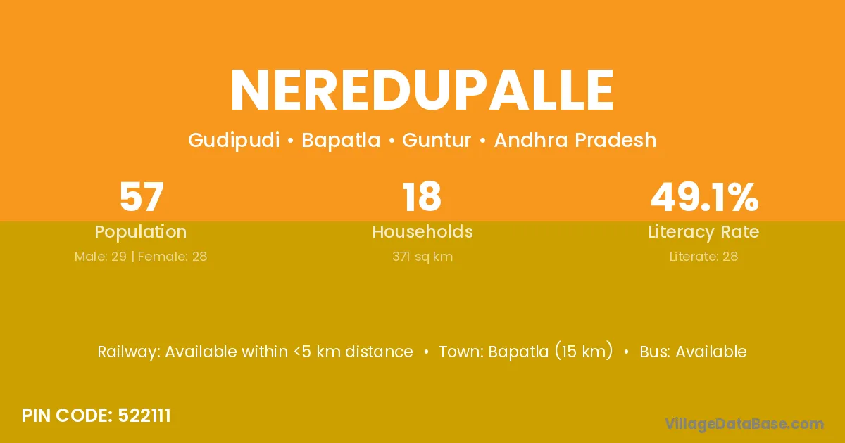 Neredupalle village has a total population of 57 people, of which 29 are males and 28 are females.