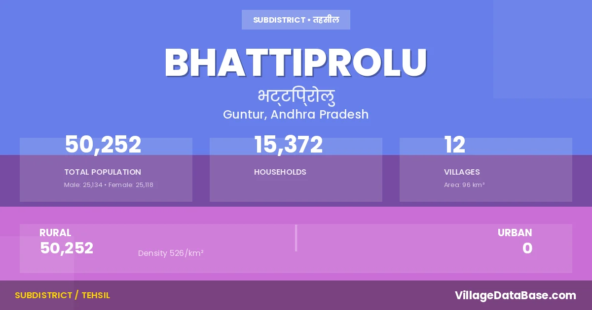 According to the 2011 census The total area of Bhattiprolu Mandal is 96 km², with a population of 50252 people. The population density is 526 inhabitants per square kilometre, and there are approximately 15372 houses in the sub district.
