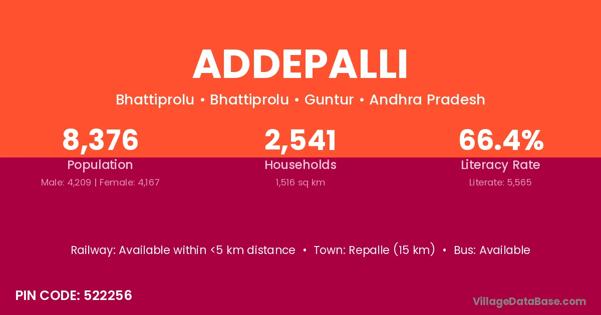 Repalle (15 km) is the nearest town to Addepalli village for major economic activities and is located approximately 15 km away.