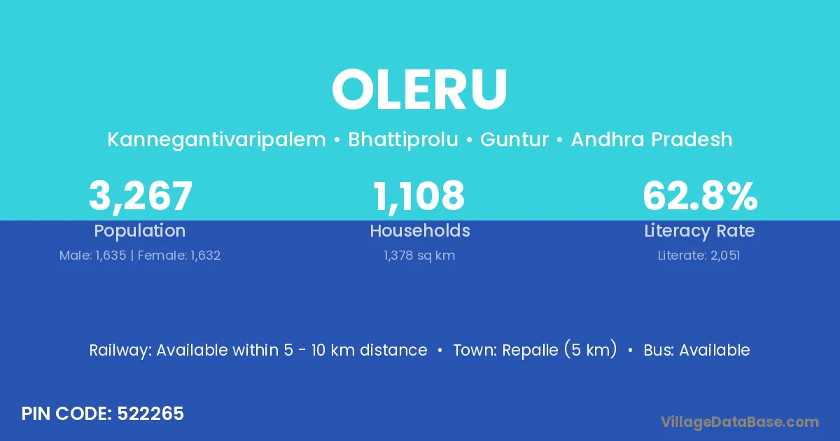 Repalle (5 km) is the nearest town to Oleru village for major economic activities and is located approximately 5 km away.