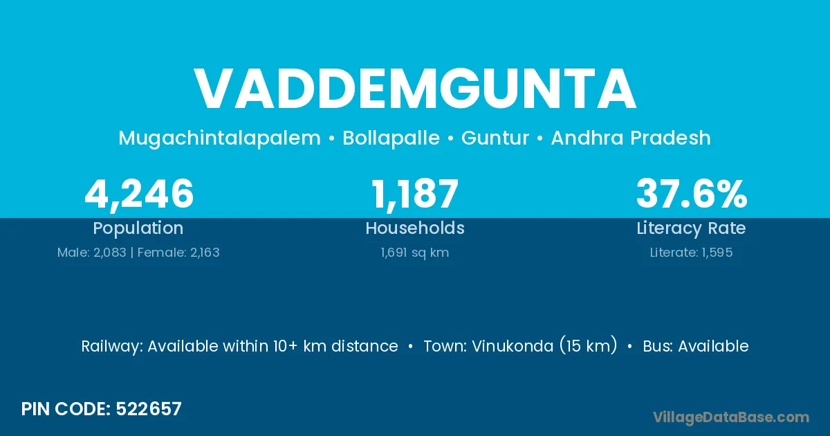 Vinukonda (15 km) is the nearest town to Vaddemgunta village for major economic activities and is located approximately 15 km away.