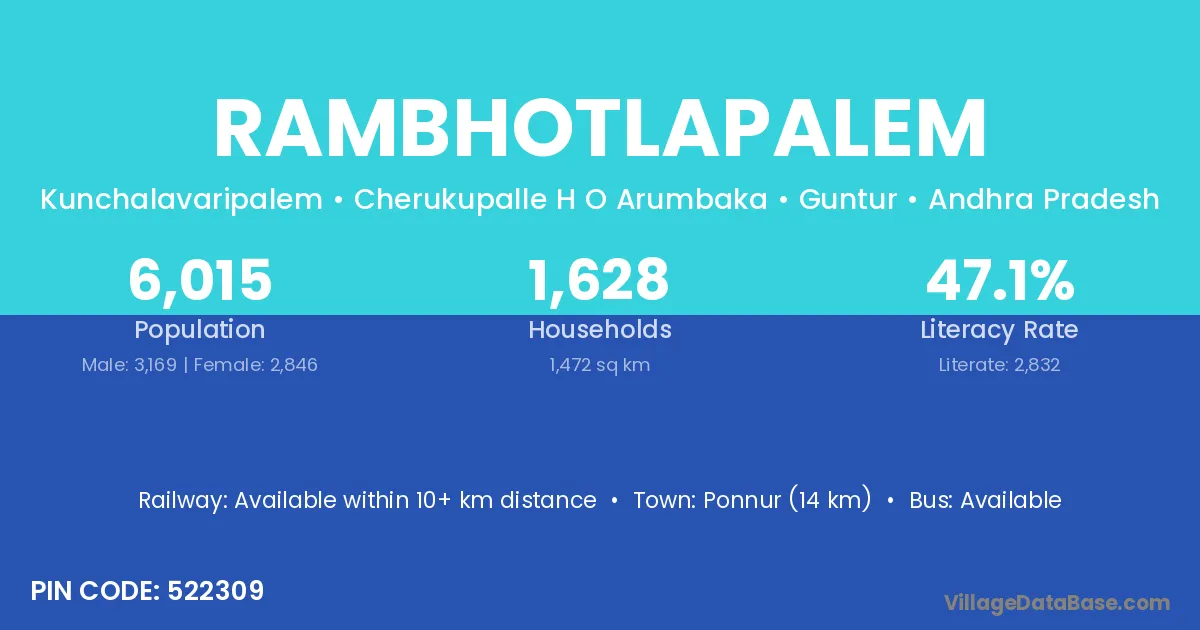 Ponnur (14 km) is the nearest town to Rambhotlapalem village for major economic activities and is located approximately 14 km away.