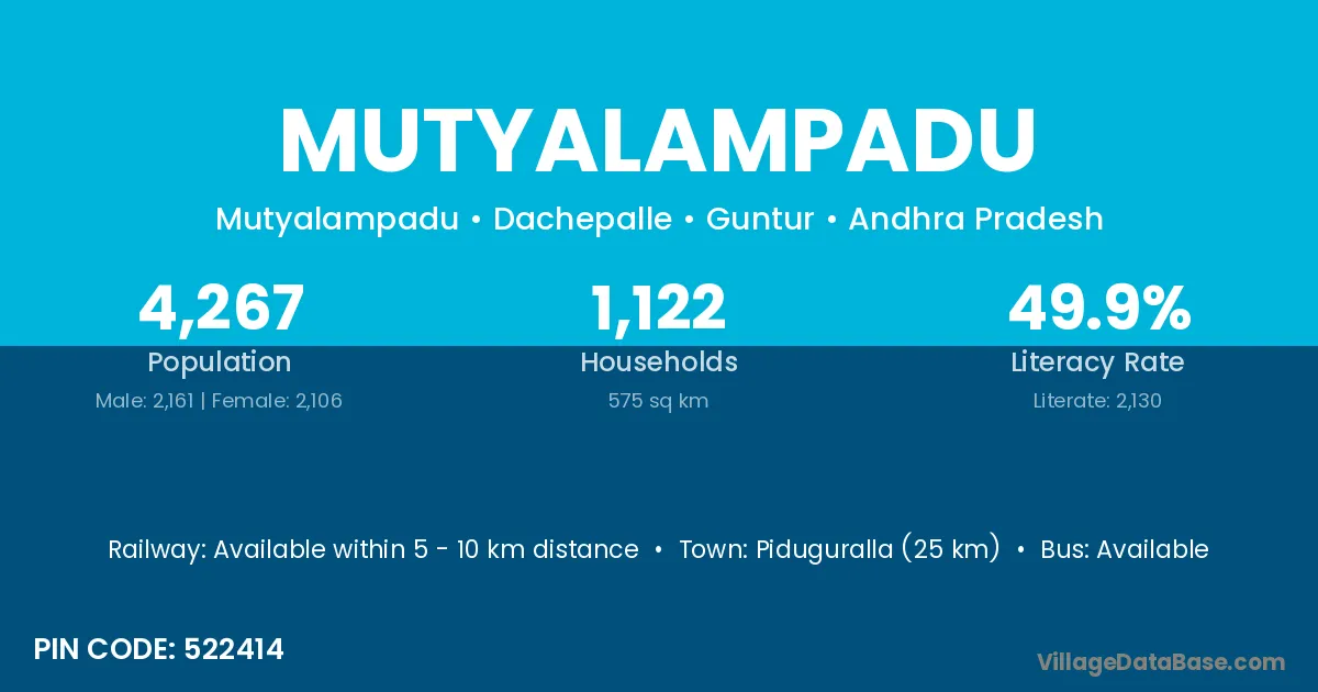 Mutyalampadu village has a total population of 4,267 people, of which 2,161 are males and 2,106 are females.