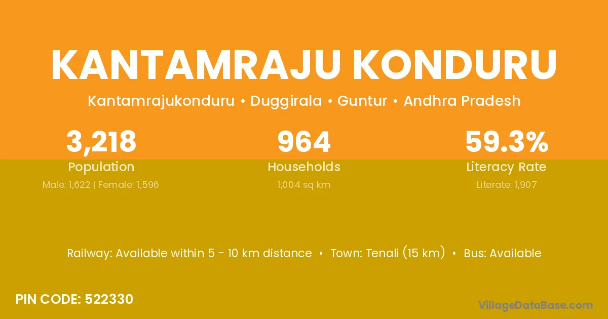 Kantamraju Konduru village has a total population of 3,218 people, of which 1,622 are males and 1,596 are females.