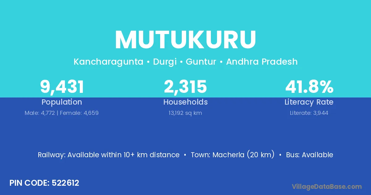 Mutukuru village has a total population of 9,431 people, of which 4,772 are males and 4,659 are females.