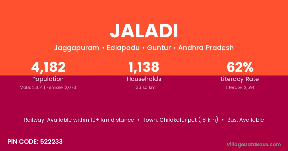 Chilakaluripet (18 km) is the nearest town to Jaladi village for major economic activities and is located approximately 18 km away.